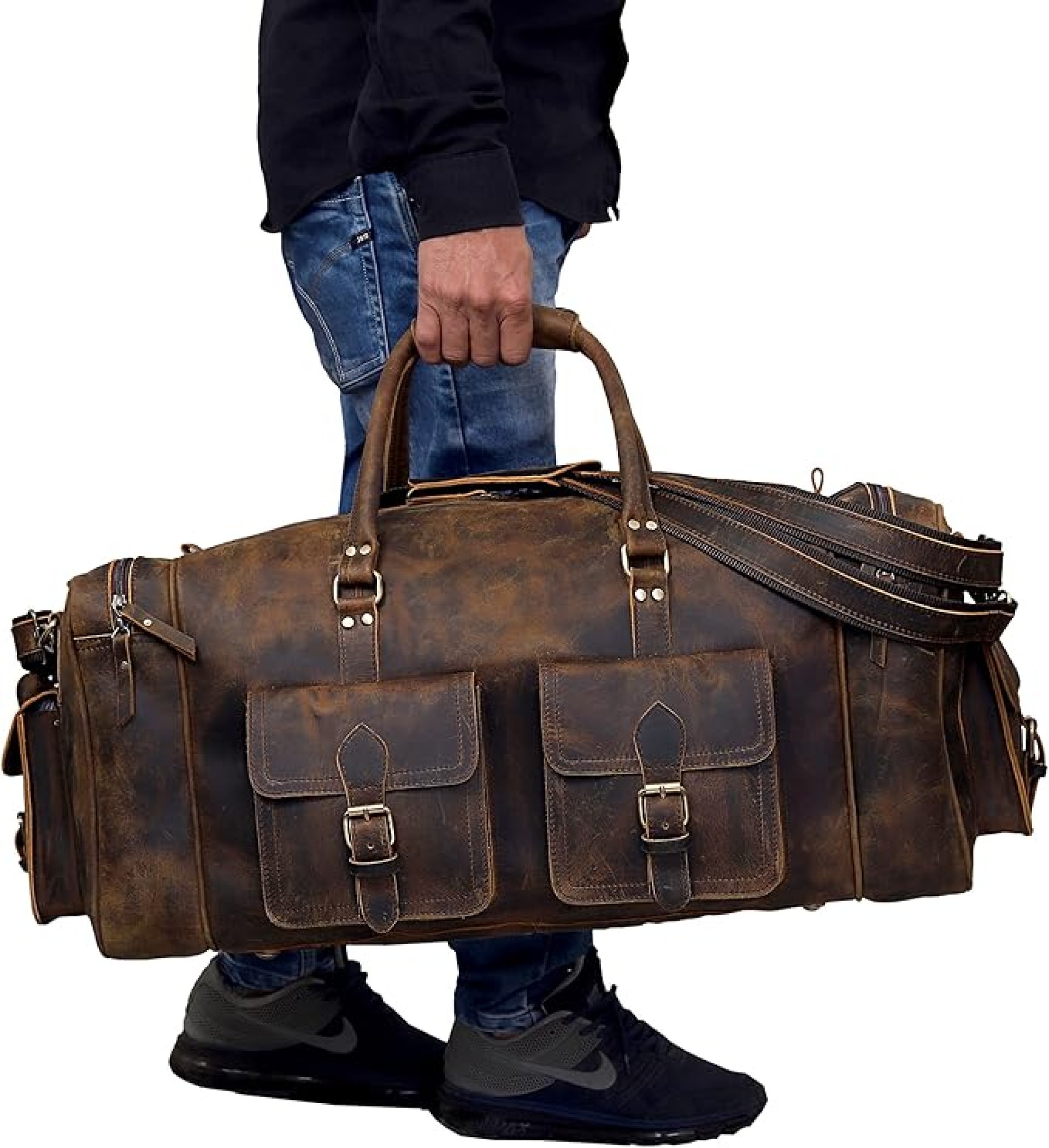 Large leather duffel bag for men and women handmade with Genuine leather and canvas lining by expert craftsmen working with leather for decades
